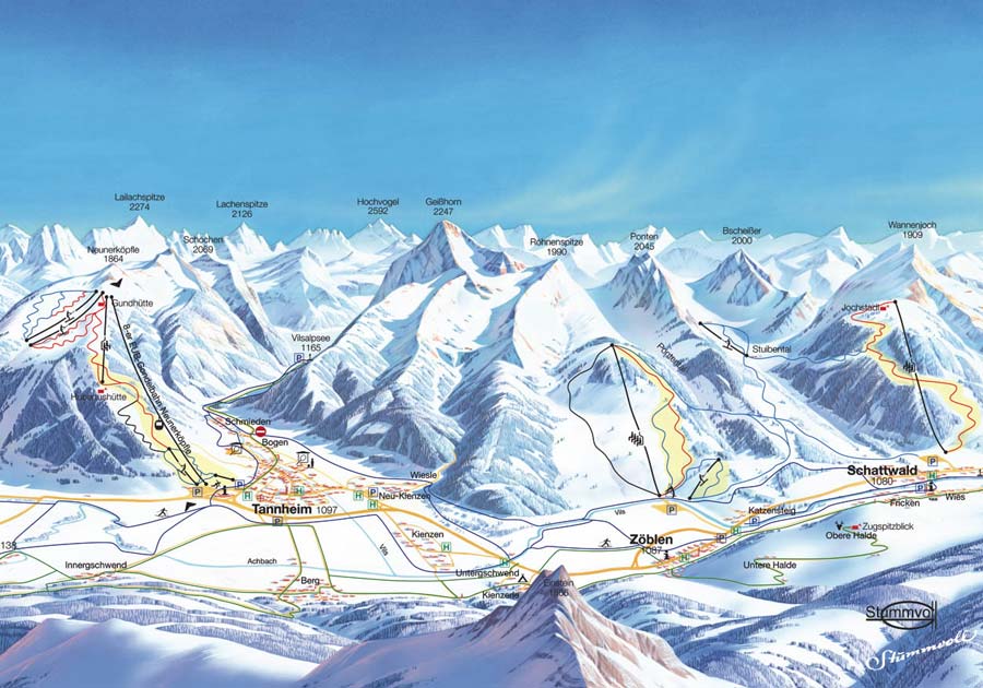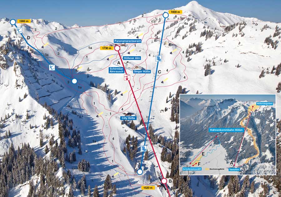 Mit der Hahnenkammbahn Höfen kommt man ins Höhenskigebiet Höfener Alm. Hier stehen zudem eine kuppelbare 4er Sesselbahn und ein Höhenschlepplift zur Verfügung. Die Zwischenstation der Hahnenkammbahn Höfen bietet auch für nicht Geübte Skispaß im Höhenskigebiet. Im Tal befindet sich der Schollenwiesenlift und der Schollenwiesen-Übungslift. Link